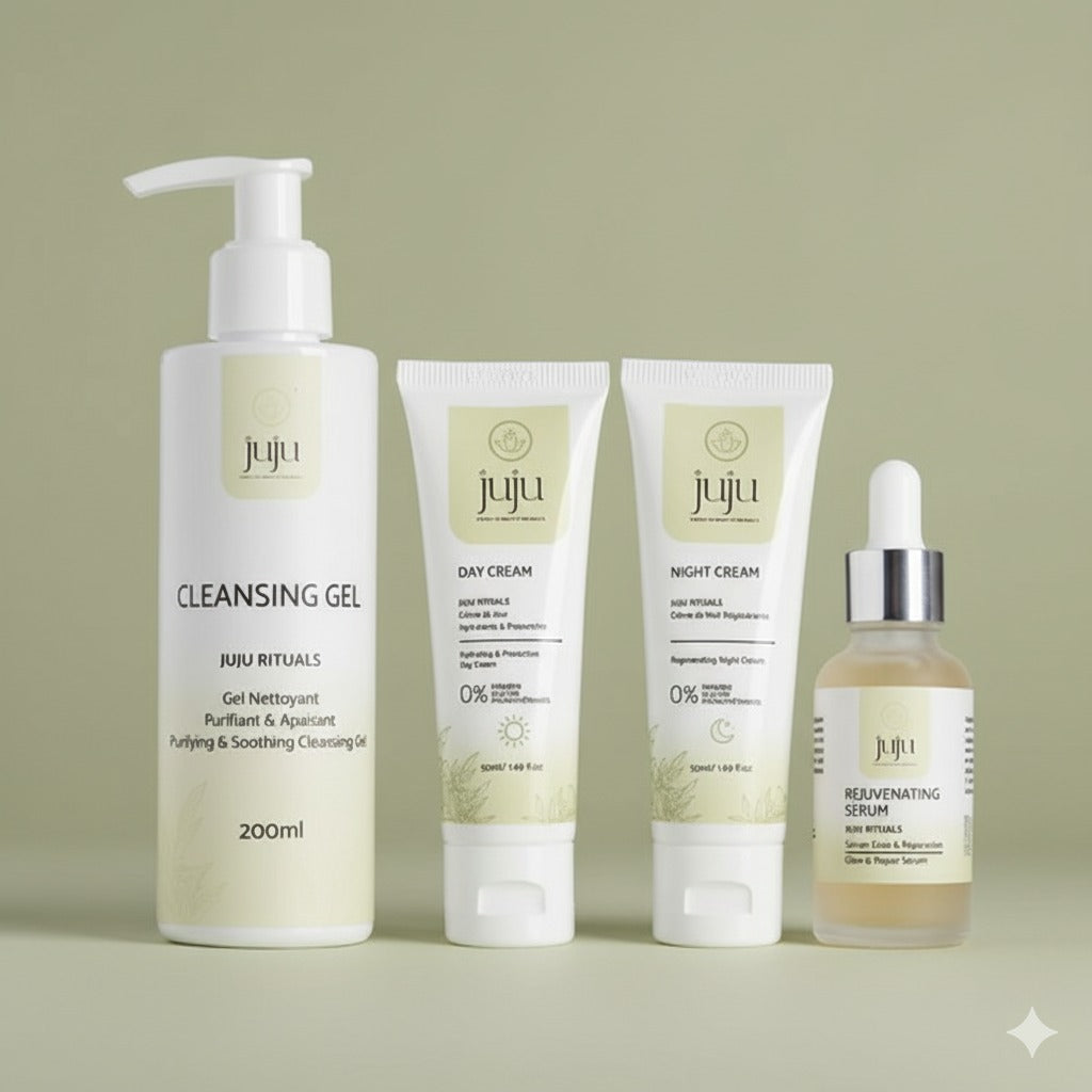 Ensemble complet de soins de la peau JUJU offre une hydratation intense, une protection antioxydante, une régénération nocturne et un nettoyage doux. Ce set comprend un sérum riche en vitamine C et niacinamide pour unifier le teint et réduire les signes de l’âge, une crème de jour qui hydrate et protège tout en améliorant l’élasticité, une crème de nuit régénérante qui nourrit et atténue les ridules, et un gel nettoyant apaisant qui purifie sans dessécher. Les formules naturelles et légères pénètrent rapidement, laissant la peau douce, éclatante et protégée toute la journée.